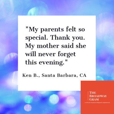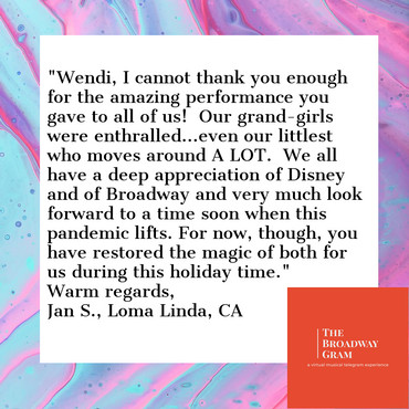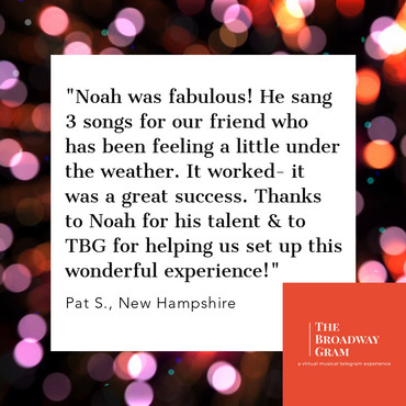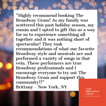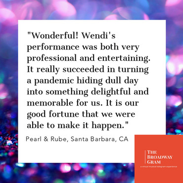 Looking to spread some cheer? Make someone's day? Have some entertainment at your family or corporate Zoom gathering? Look no further! Our Broadway artists have their classics standing by to make your day and celebrate your special occasion!